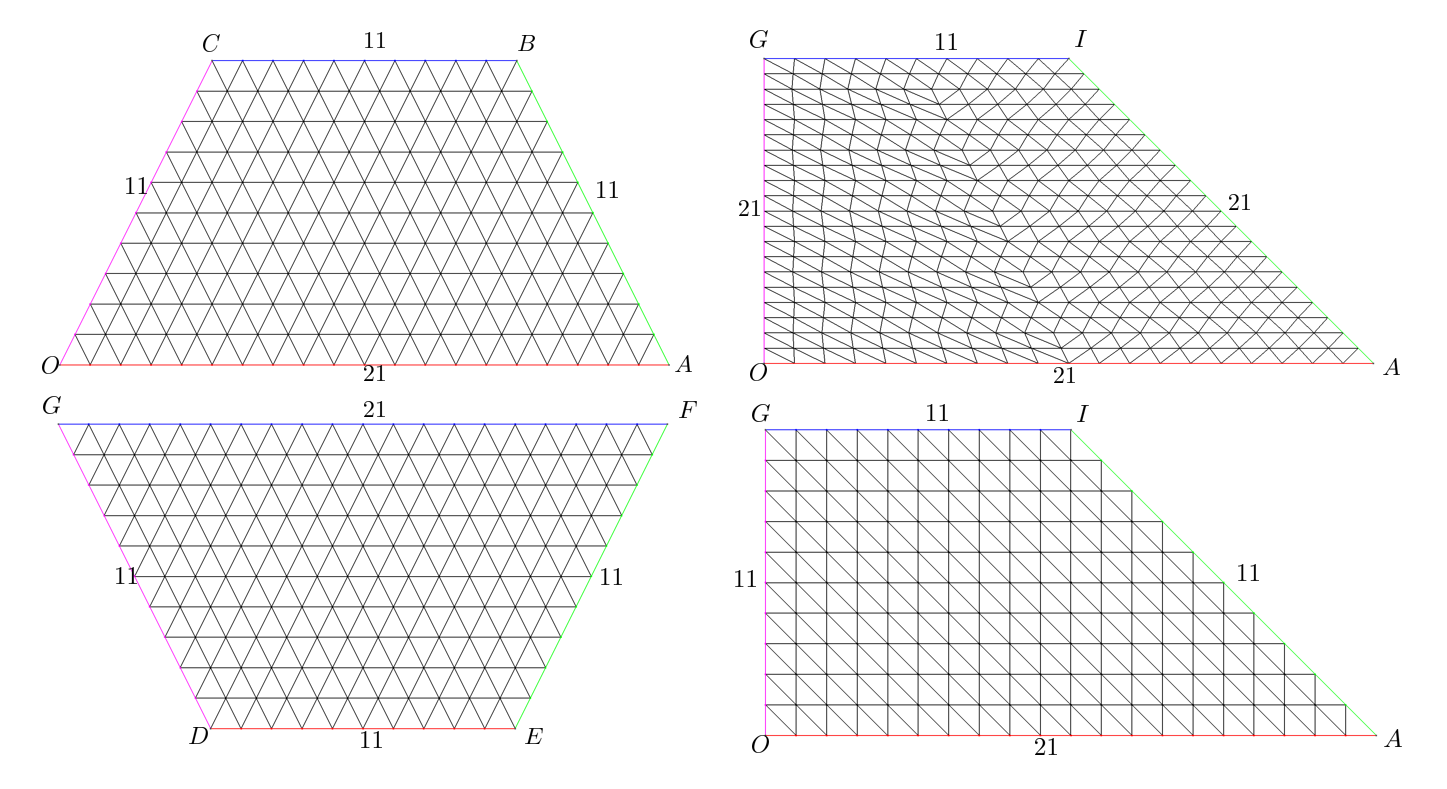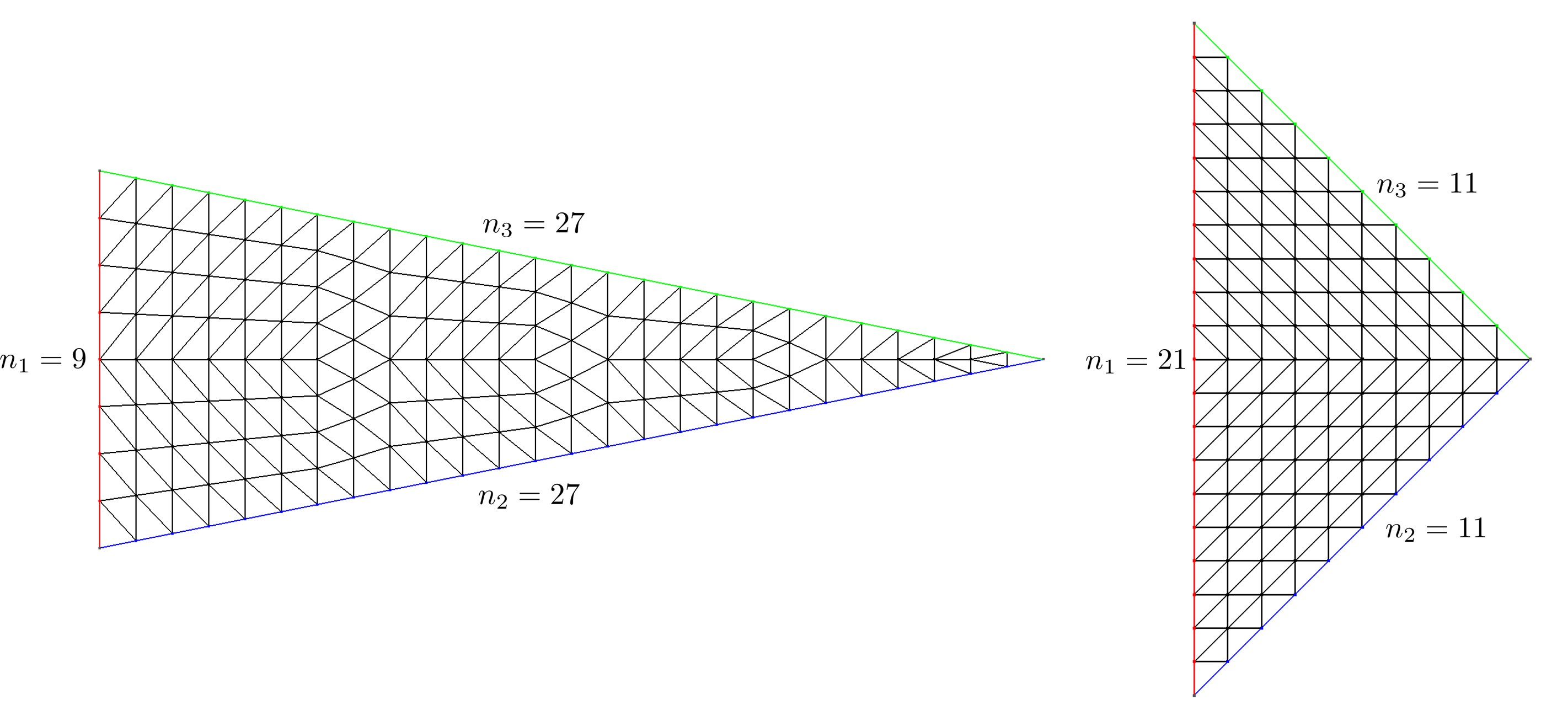For triangle (say (A,B,C)), if the angle at C is less than \(2\pi/3\), the mesh is built from the number of nodes on AB segment (say \(m\ge 3\)) and the same number of nodes on sides AC and BC (say \(p\ge 3\)) with \(p\ge m\).