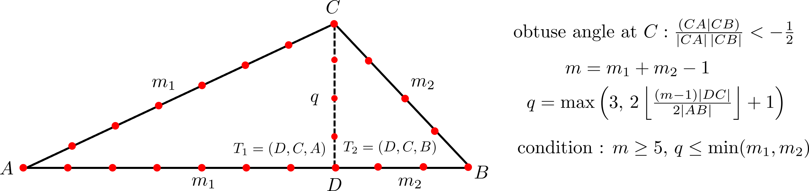 For ‘oblate’ triangle (angle at C greater than \(2\pi/3\)), the triangle is split into two triangles (ADC) and (BDC) with D on the side AB (foot of the perpendicular from C to AB). Then, the number of nodes on each edge are determined in order to apply the previous algorithm to each of the two triangles. There is the same number of nodes on edges AD and AC, and the same number of nodes on edges DC and BC.